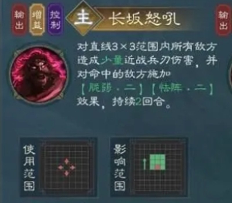 万人敌是张飞的核心增益效果,场上每存在1名敌军,他就能获得10%的兵刃增伤和5%的兵刃减伤,最多可叠加10层。这个效果让张飞在战斗初期就能快速建立优势。长坂怒吼是他的主动技能之一,能对九宫格范围内的敌人造成兵刃伤害,并附加降低防御和暴击抗性的负面效果。