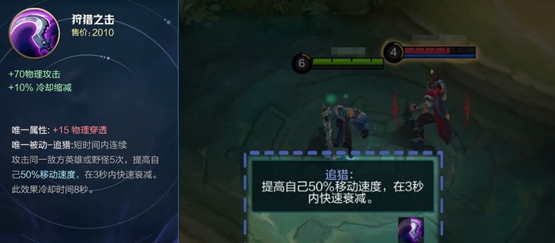 狩猎之击是决胜巅峰中一件2100金币的攻击装备,提供80点攻击力和10%技能冷却缩减。装备还附带15%物理穿透效果,连续攻击同一目标或击杀野怪5次后能获得50%移速加成,这个效果在追击和撤退时都非常实用。