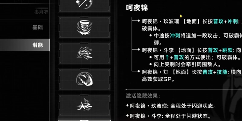 枣麻衣的基础面板中穿透能力数值突出,这使得她在对抗BOSS时表现优异。她的两个特殊技能各具特色,第一个技能”呵夜锦”通过组合按键操作,可以附加破甲buff并击破敌人霸体状态。这个技能对高护甲敌人特别有效,操作时需要同时按下普通攻击键和冲刺键或跳跃键。