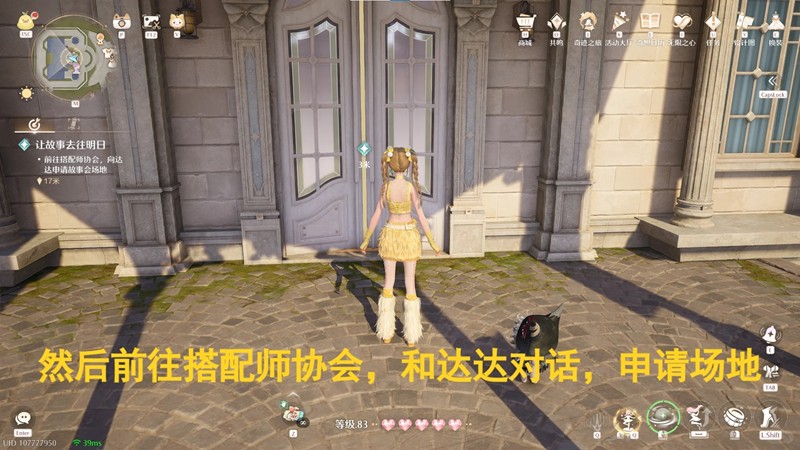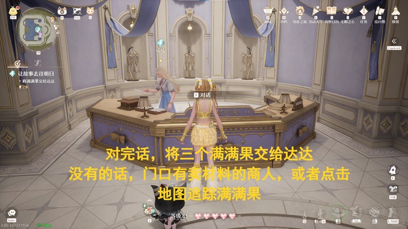 然后向后转,看到菲比,与菲比对话;对完话,前往搭配师协会,向达达申请场地;然后将满满果交给达达(没有的话点击地图追踪满满果或者在搭配师协会门口广场大树周围的花坛里有满满果)