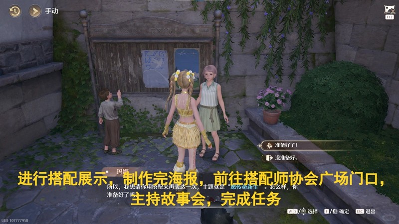 接着,跟随指引,找到玛娜,和她对话,请她帮忙制作海报,进行搭配展示;在4-22点(白天),在搭配师协会广场上主持故事会;