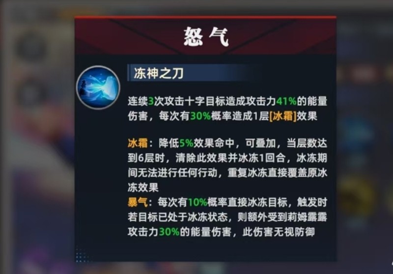 莉姆露露的普通攻击从第二回合开始就能触发爆气状态,对敌方随机三个目标造成伤害并有概率附加冰霜效果。她的必杀技针对单体目标造成能量伤害,50%几率附加冰霜效果,爆气状态下还会优先为无护盾的队友施加护盾。怒气技能可对十字目标进行三次攻击,每次都有30%几率附加冰霜效果,爆气状态下每次攻击还有10%几率直接冰冻目标。