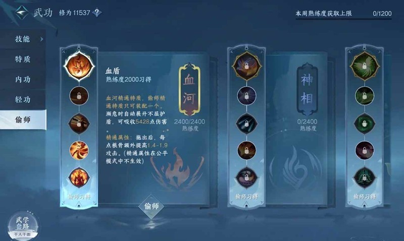 偷师血河两次,获得一个主动技能之后挂木桩刷熟练度(开一键连招长按3秒之后会自动打),剩余活力全部用来升演奏,必须七级演奏才可以学太极图!!这是现版本铁衣必带技能,很多时候进本就靠它了