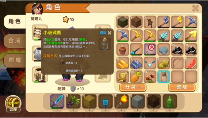 将收集到的细沙放入熔炉中,加入煤炭烧制就能得到玻璃方块。玻璃方块可以在工具箱中加工成玻璃片,再配合木板就能合成玻璃瓶。