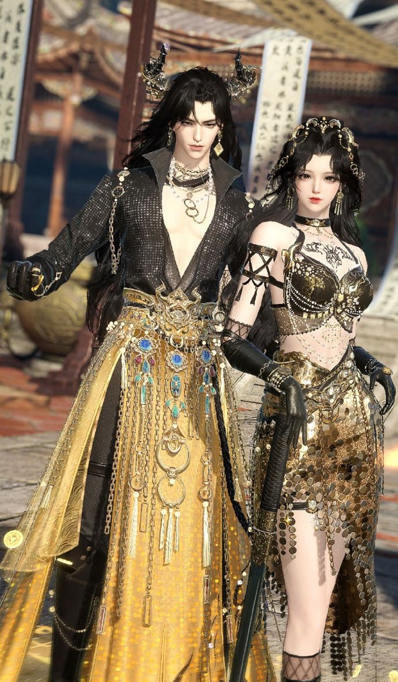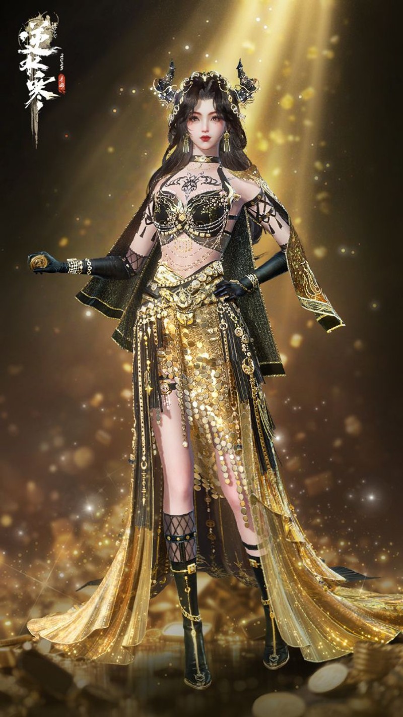金筹曜夜时装的设计灵感来源于古代贵族的奢华服饰,融合了现代时尚与古典美学。金色的流光在衣摆间流转,仿佛星辰坠落凡间,每一处细节都透露出高贵与典雅。时装的整体造型以修身剪裁为主,搭配精致的金色刺绣和流苏装饰,展现出独特的魅力。