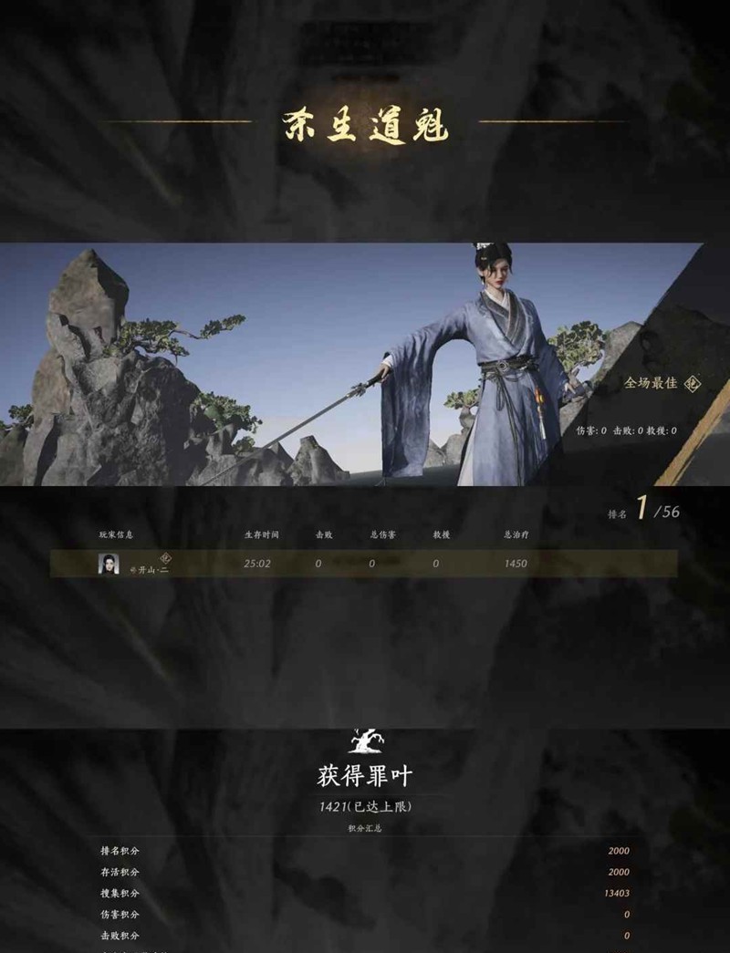 这样一场下来差不多就10分钟左右。我总共就打了四把,前两把在苟,苟了二十多分钟才给200多罪叶,后面两把就去逛街了,杀两个人机做三个任务再捡一堆垃圾能给到900罪叶,p2是我最后一把,可以看到搜集积分最多,比杀人机给的还多,要不是上限了至少能给1000罪叶。所以大家想速刷的话就积极捡垃圾吧,你会发现捡垃圾其实也挺好玩的