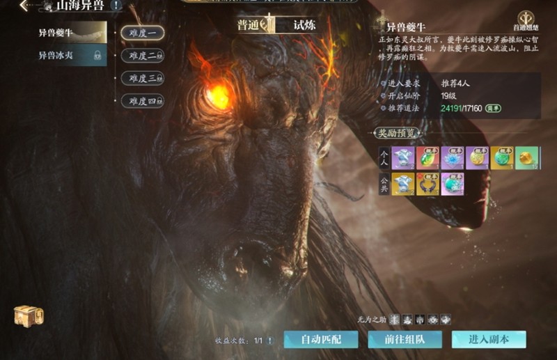 异兽夔牛是玩家早期会遇到的一个强力boss。战斗开始时,boss会释放激光和红色范围技能,需要及时分散躲避。当出现黑洞时,要迅速远离避免持续掉血。在boss血量降至80%时,会召唤陨石攻击,玩家需要引导陨石砸向boss造成额外伤害。这个阶段要特别注意走位,争取更多输出机会。