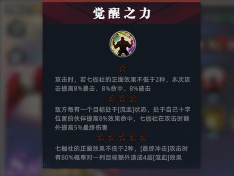 怒气技能可以对一列目标造成伤害,同时提升同排队友10%攻击力。爆气状态下自身也能获得10%攻击力提升,持续两回合。觉醒后的七枷社在拥有两种以上正面效果时,能获得暴击、命中和破击加成。如果目标处于流血状态,还能获得额外伤害加成。