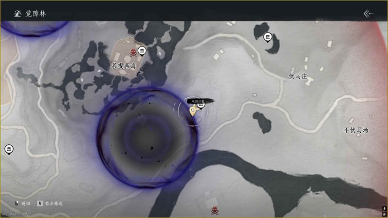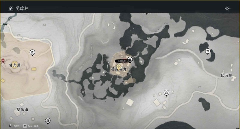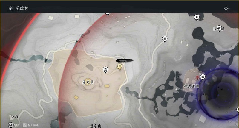进入觉障林就开始往菩提苦海标点处去,随后去怜花禅院据点的标点处,然后是酒肉山林据点的标点处,接着去佛光顶小路的标点处,再爬上佛光顶塔边的标点处,然后去p9的标点处,最后去慈心镇的标点处