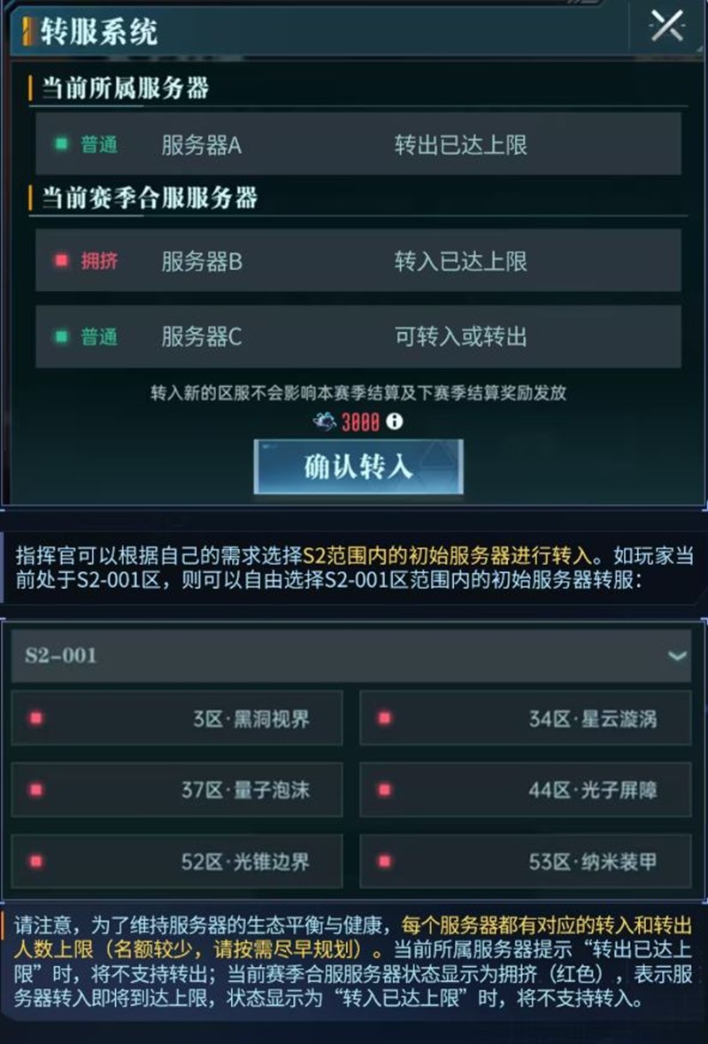 进入转服系统之后,可以查看当前所属服务器以及当前赛季服内其他初始服务器的状态信息。指挥官可以根据自己的需求选择S2范围内的初始服务器进行转入。如玩家当前处于S2-001区,则可以自由选择S2-001区范围内的初始服务器转服。