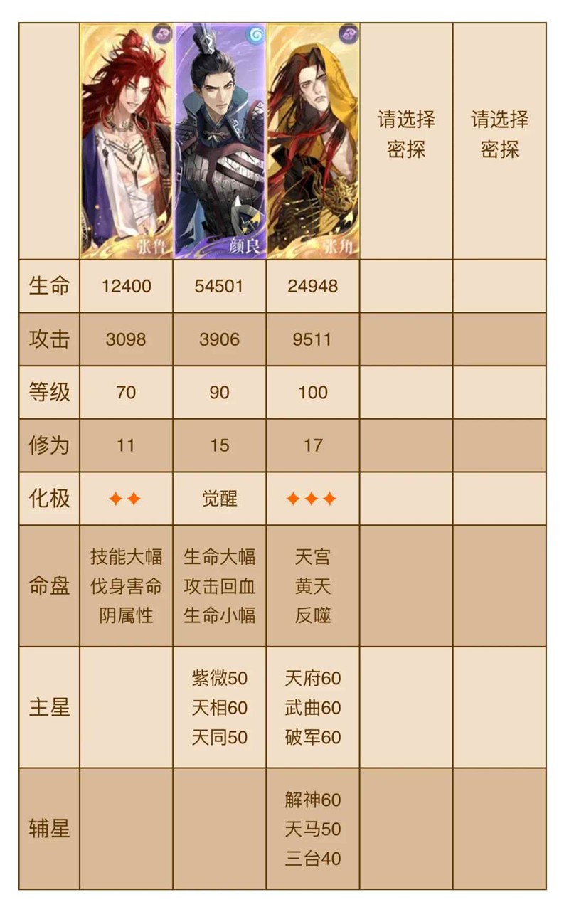 是第五关花枝丸用角鲁队打的出手顺序和练度参考,总结就是boss第一条命时张鲁颜良下拉,把巨浪传给张角,boss第二条命时张鲁下拉,把巨浪传给颜良,其他时候颜良全程普攻,张鲁张角有大放大;