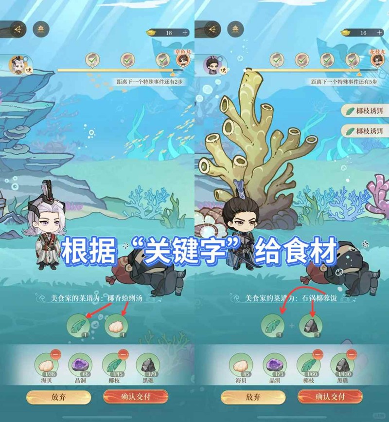遇到盗贼美食家,可以根据他的关键字给食材,如提到石头就是给黑礁,提到椰香椰蓉就是给椰枝;