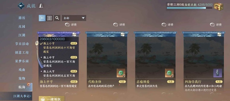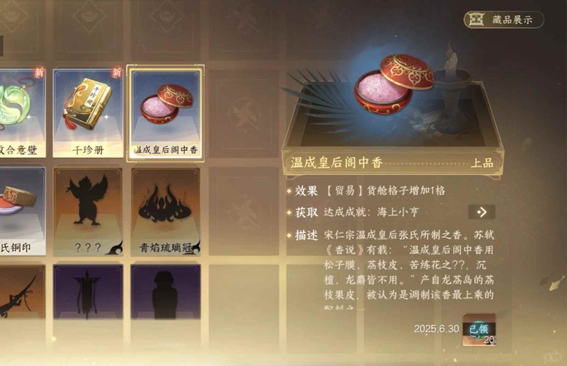 第二个格子:利润达到10万可获得海上小亨成就与温成皇后阁中香,可增加一个货舱格子!