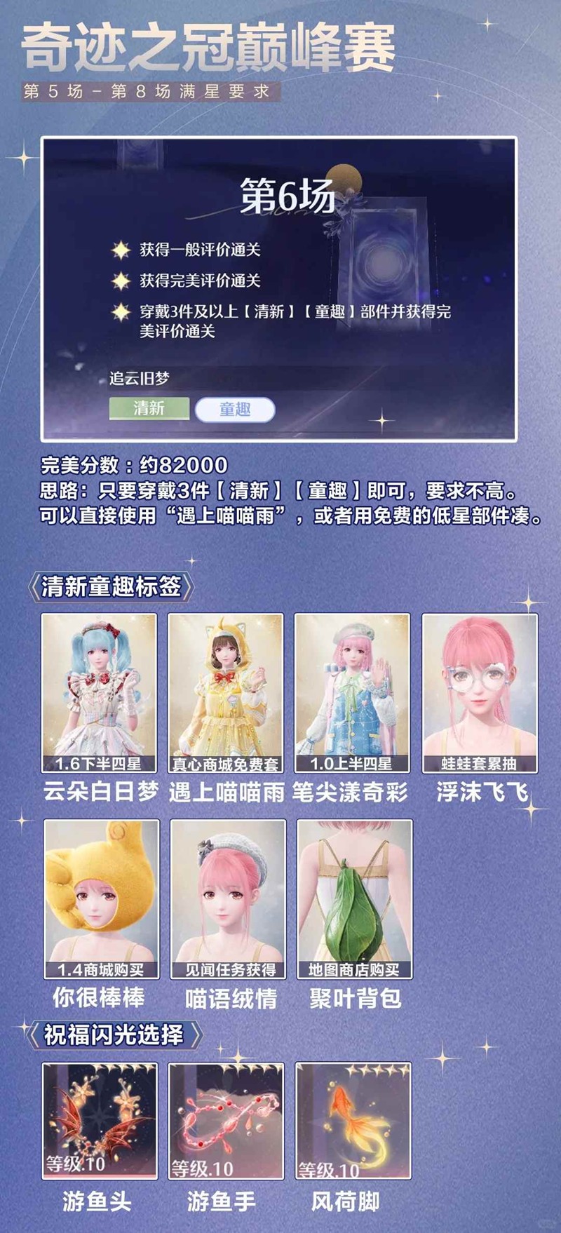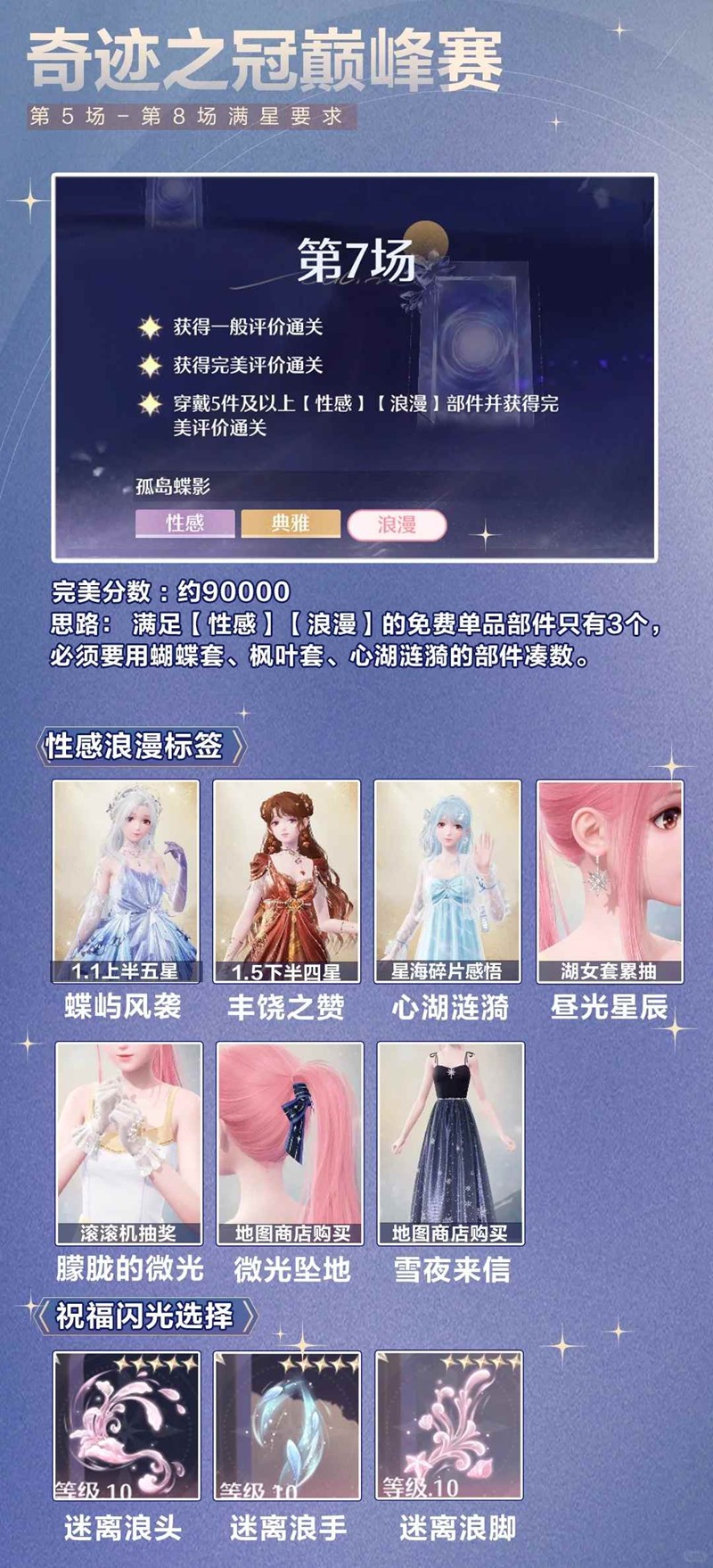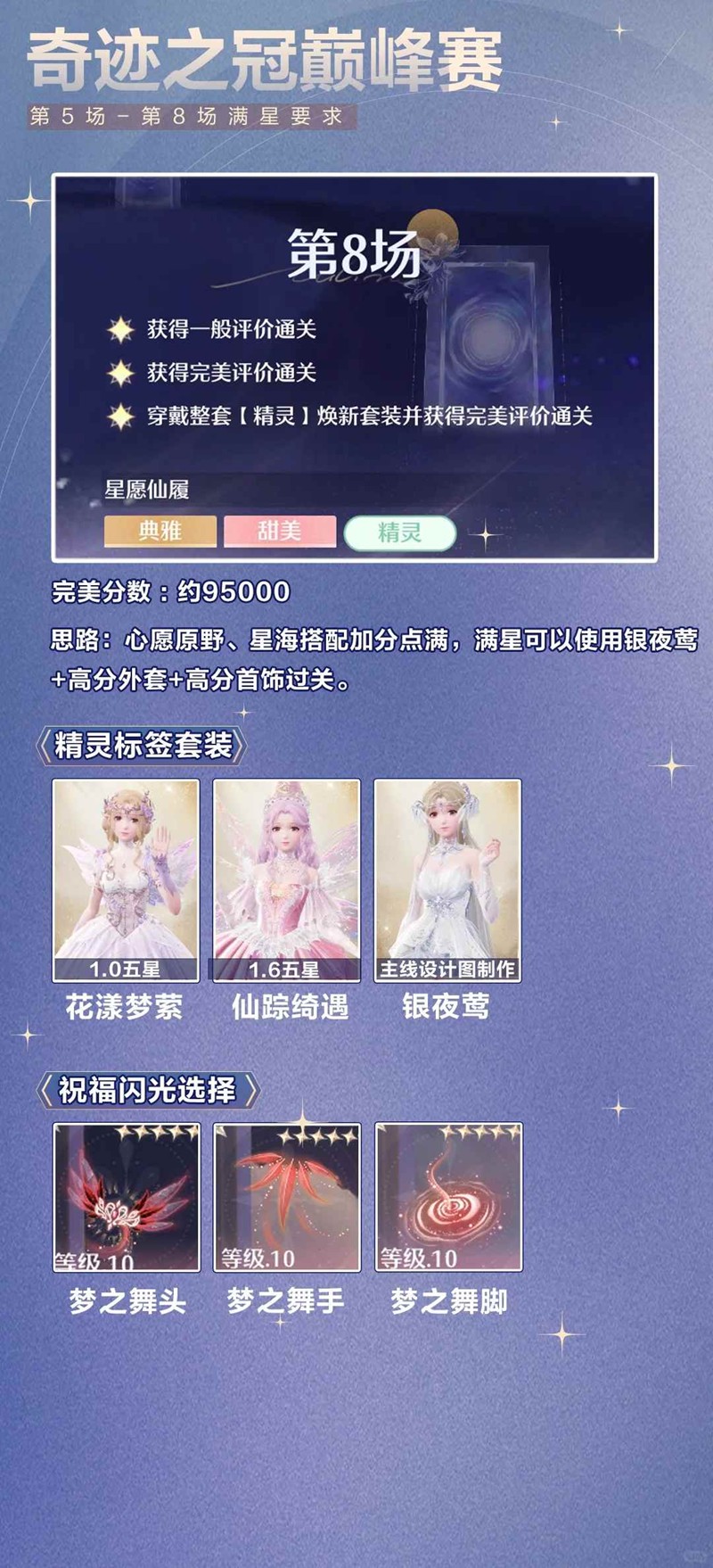 > 第8场如果没有精灵套、仙子套,可以使用焕新后的银夜莺+高分外套配饰满星