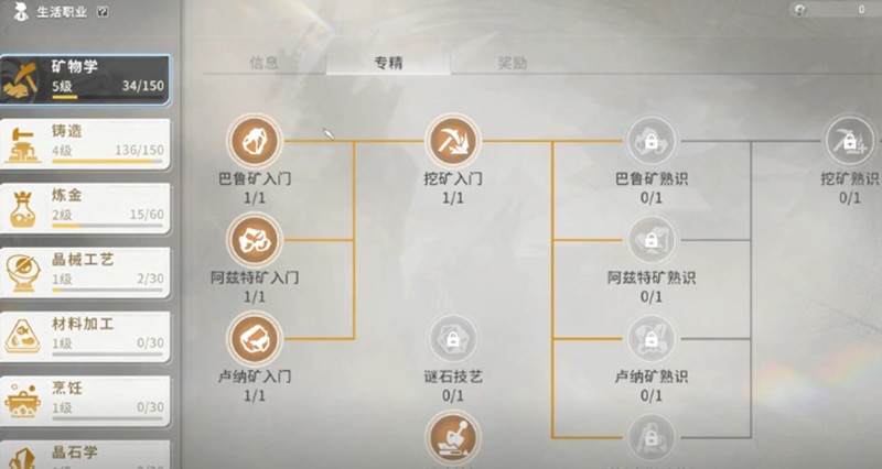 玩家需要选择矿物学生活职业来获取巴鲁矿石、奴娜矿石和阿兹特矿石。学习入门技能后,可以通过追踪功能快速定位矿石位置。每次采集消耗10点精力,可获得2点职业经验和5个对应矿石。建议优先采集巴鲁矿,这是最基础的铸造材料。