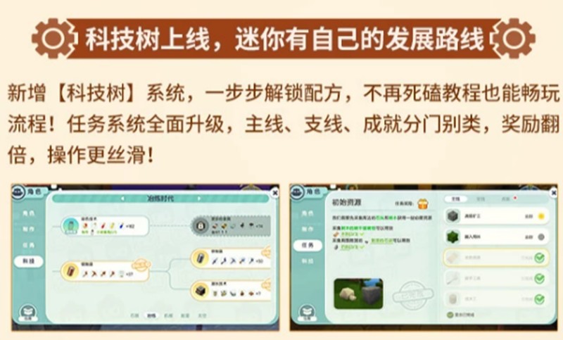 机械时代版本最核心的更新就是加入了科技树系统。玩家可以通过探索和完成任务来解锁各种制作配方,逐步提升自己的科技水平。这个系统让游戏进程更加清晰有序,同时也增加了游戏的策略性和可玩性。