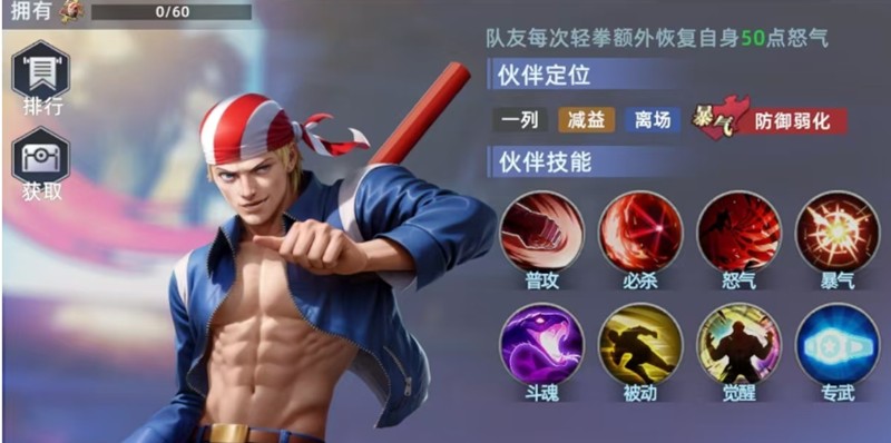 比利的主要技能”重拳”可以提升20%命中率,效果持续三个回合。必杀技”能量冲击”能对单体目标造成能量伤害,同时有60%概率降低目标免伤属性并削减怒气值,这些减益效果可以持续两个回合。