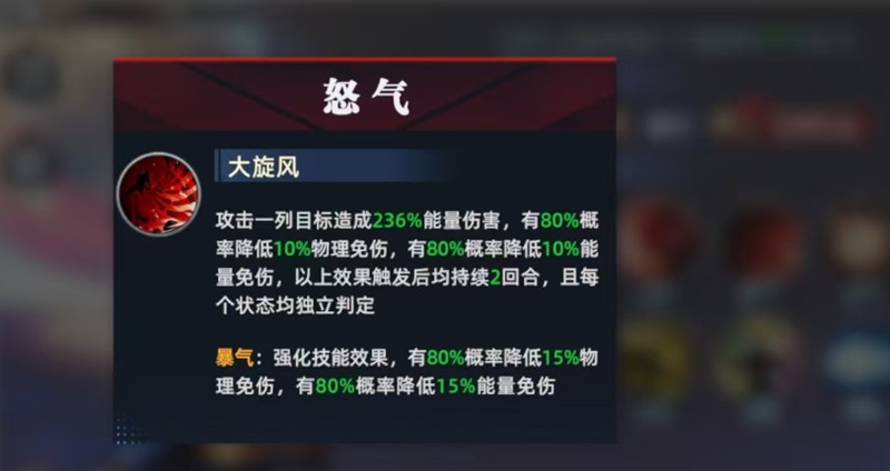 怒气技能”列阵打击”则能攻击一列敌人,80%概率降低目标物理防御,强化后效果提升15%。