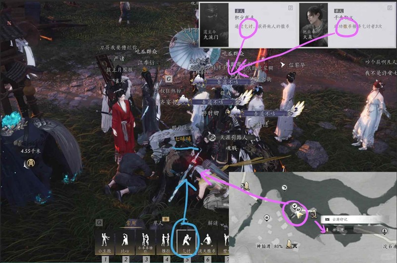 完成攻略:传送到多人世界——传送到『神仙渡』,来到右下角这个位置,有一群人聚集在这里,地上跪着的有Npc,我们站在站在npc的正对面点「撒币」就可以了。然后我们再跟地上的人一起跪到地上「乞讨」。