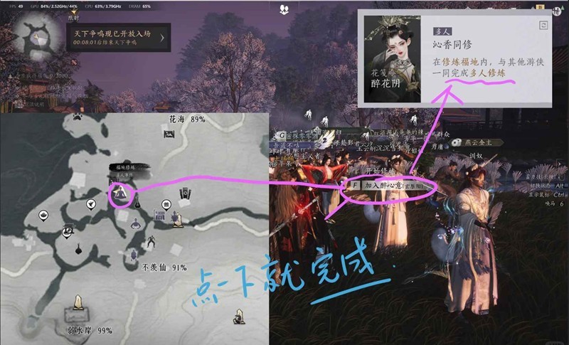 首先我们要进入多人世界,其次打开地图,可以看到p5的左下角,我们是在不羡仙的上面,有一个人在打坐,这个位置就是「福地修炼」,你靠近你就会看到他是一个浅蓝色的圈圈,我们就直接进去,点击『加入修炼』,然后走到人多的地方,看到加入XXX(xx),点击『加入XXX(xx)』,然后就会显示你的任务已经完成啦~
