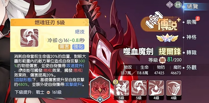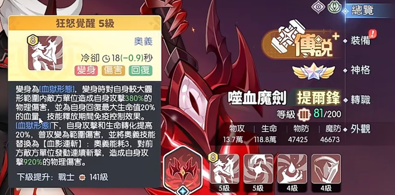 奥义技能狂怒觉醒让提尔锋变身为血狱形态,对周围敌人造成380%物理伤害并恢复20%最大生命值。在血狱形态下,她免疫所有控制效果,普攻变为范围伤害。此时奥义变为血影连斩,造成920%物理伤害,仅需3点能量。