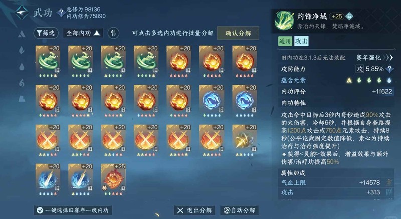 3.内功可以在菜单内功里批量分解旧赛年1级内功,不用一个一个点