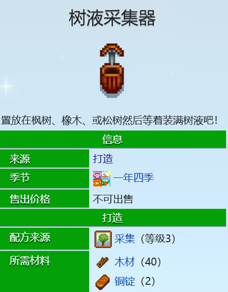制作树液采集器需要40个木材和2个铜锭。木材可以通过砍伐普通树木获得,铜锭则需要先采集铜矿石,然后在熔炉中使用煤炭进行熔炼。制作完成后,树液采集器会出现在背包的建造菜单中。