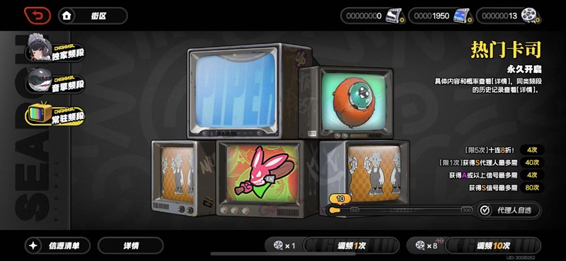游戏中的抽卡分为三个频段:独家频段、引擎频段和常驻频段。独家频段主要抽取代理人和装备,引擎频段专门获取引擎武器,常驻频段则使用原装母带抽取各类道具。虽然三个频段的单抽价格相同,但各自抽取的内容有所不同。