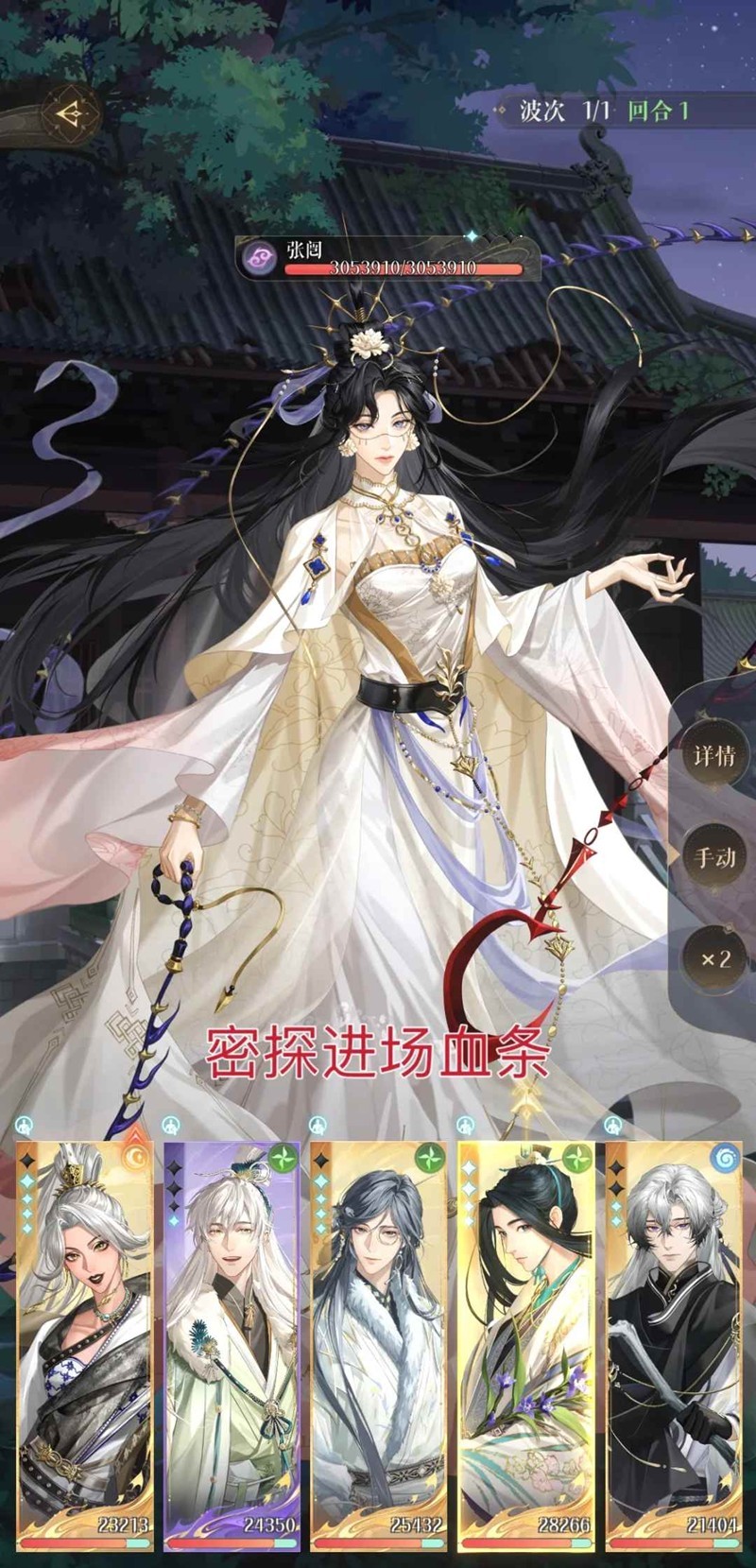 1. 每5回合张闿会进入【潜行】状态,让我方攻击最高的密探失去99%生命,并附加一层【虚弱】紫色框,该密探攻击力/增伤/受治疗效果全部降低,只有回满血后才能解除虚弱状态