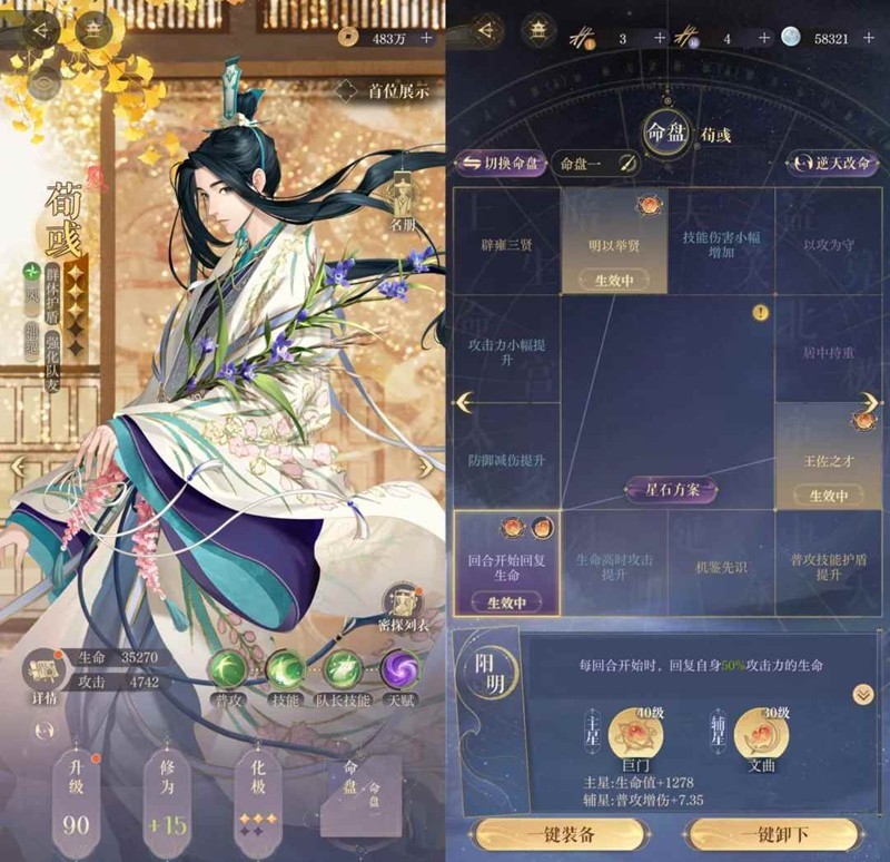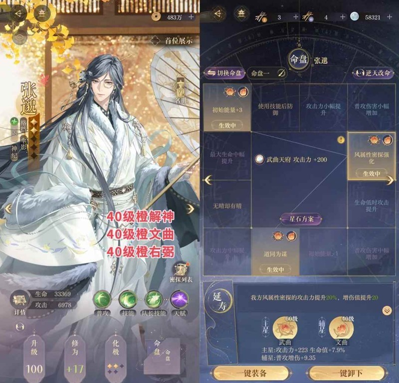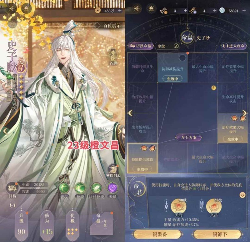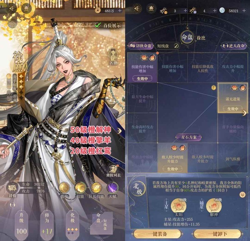 3. 徐庶尽量不要装武曲辅星,因为加的生命的太高了可能在3回合内奶不满,我的徐庶是3星,生命可能高一些,徐庶生命比我低的,史子眇和王粲的攻击可以低一些