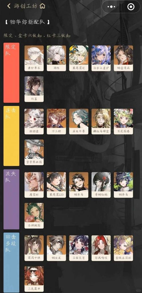 限定队:造价高,输出高,生存高,分散站位影响小。6931(六致知酒帐3致知素纱单衣)本身可以单拎出来。利簋可以给到酒帐,两轮七动。海水拐莫高窟记,铜壶可以挂脆弱,补能量。这里替代位酒帐→水晶杯,利簋铜壶非刚需,海水→三兔。
