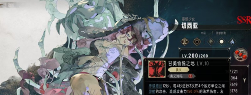 甘美愉悦之地是持续12秒的范围伤害技能,能对4个敌方单位造成相当于攻击力150%的法术伤害。当目标超过3个时,攻击频率会提升并额外增加6次攻击,这让切西亚在面对群体敌人时能发挥最大威力。