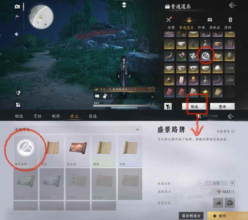 路牌在制造界面可用体力制作,在背包里找到路牌可投放使用