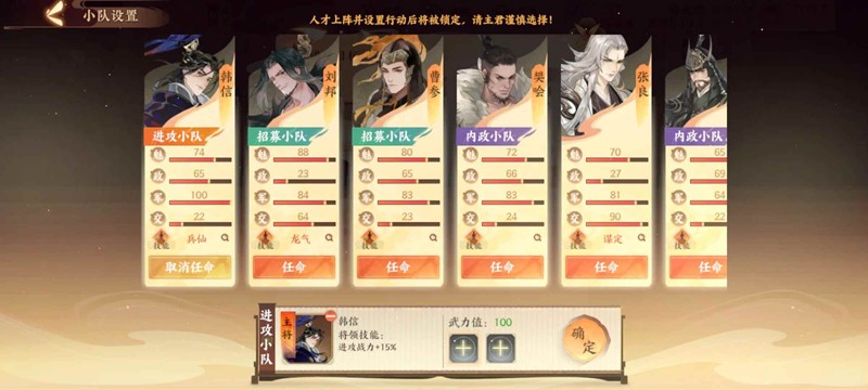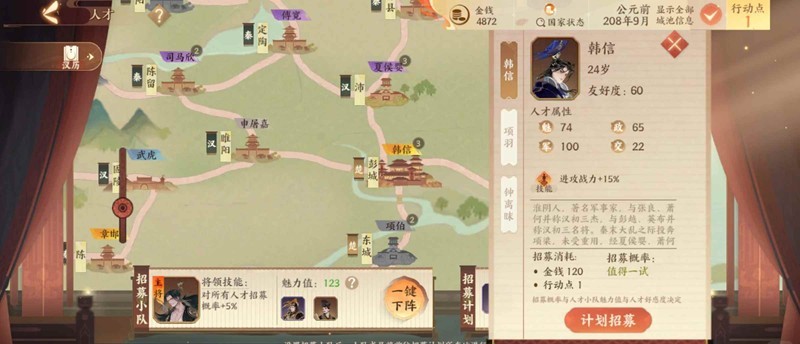 3.值得一提的是,我们不用跟历史进程走,这里很快在彭城就会出现我们的兵仙韩信了,我们直接截他项羽的胡,直接把魅力最高的几个去招韩信,如图,招募成功后,高歌猛进剑指咸阳。