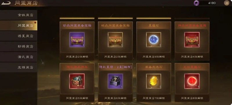 同盟商店的神兵箱子是最优先兑换的物品,虽然需要较多兑换币但价值很高。其次是能抽取吕布、貂蝉等强力武将的无双星蕴石。这两样兑换完后,再考虑普通星蕴石和练体材料等物品。