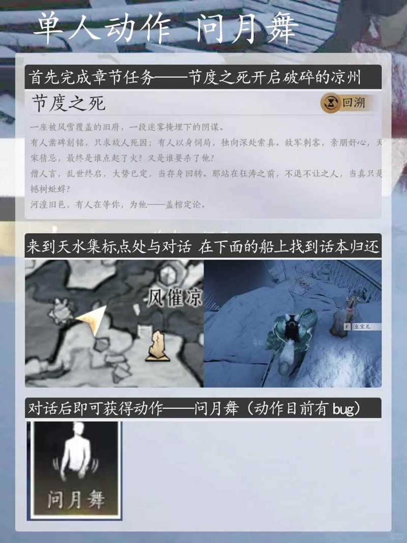 以上就是燕云十六声凉州动作问月舞获取攻略的全部内容了,更多游戏资讯,攻略内容敬请关注,您的支持是我们努力的动力!