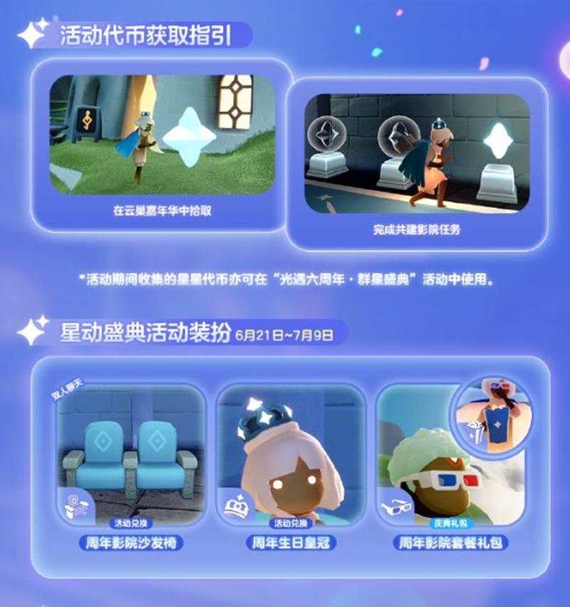 活动代币作为兑换核心道具,其收集效率直接影响限定物品的获取进度。活动代币可以从云巢嘉年华中拾取、完成共建影院任务;活动期间收集的星星代币,还可用于“光遇六周年・群星盛典”活动。