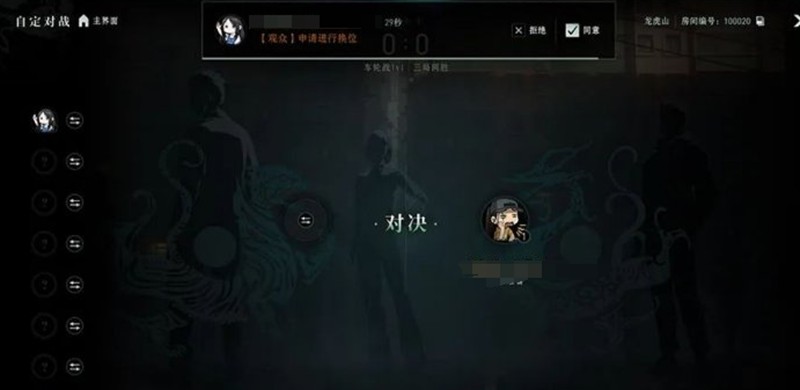 进入房间后,玩家可以选择成为选手或观众。准备阶段点击准备按钮即可开始比赛,未准备的选手可以申请更换位置。选手掉线后系统会保留比分300秒,超时则判负。观众可以随时观战或退出,比赛采用名牌规则,已出战角色在一定时间内无法重复使用。