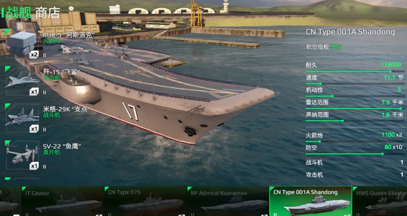 山东舰的基础属性相当出色,133000的耐久值确保了它在战场上的生存能力。11.7节的航速配合5点机动性,让这艘航母在移动时更加灵活。7.3千米的雷达探测范围和1.8千米的声纳范围,为舰队提供了良好的侦查能力。武器系统方面,两枚1100火力的单轨火箭炮配合80×10的防空数值,使其在攻防两端都有不错的表现。