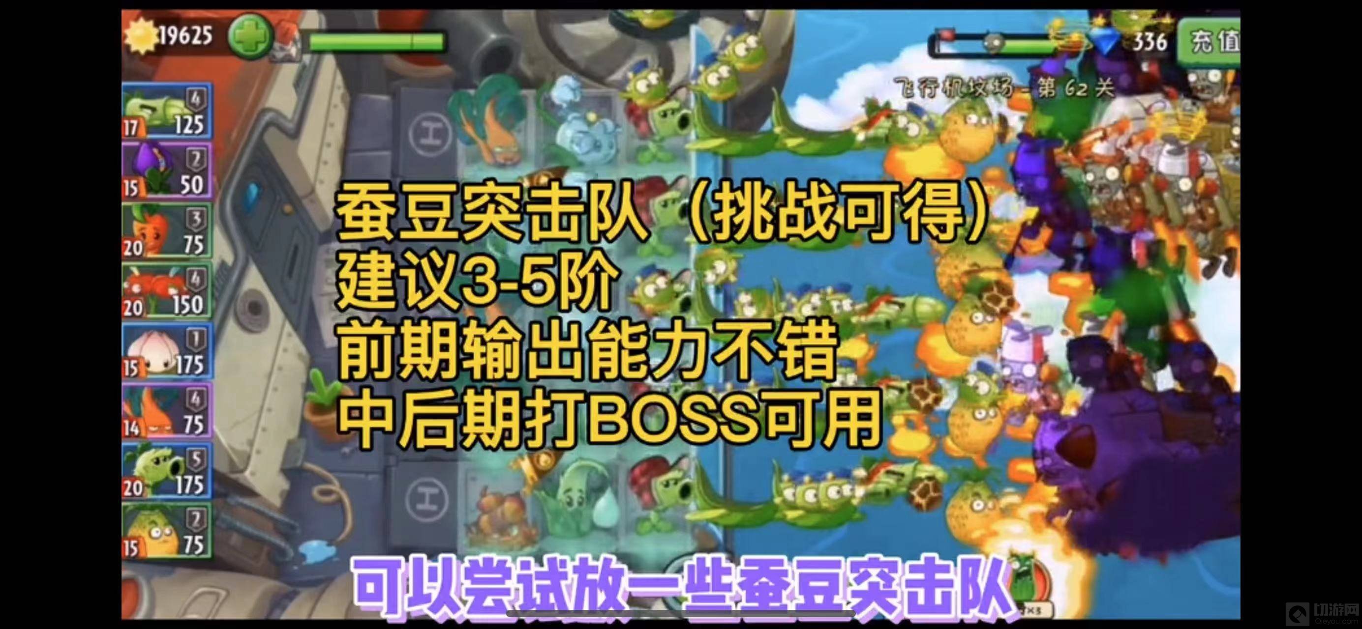 3、在芦笋飞机和旋转芜菁后面可以尝试着放一些蚕豆突击队。当然如果你有条件的话,也可以通过无土栽培放置一些陆地植物。