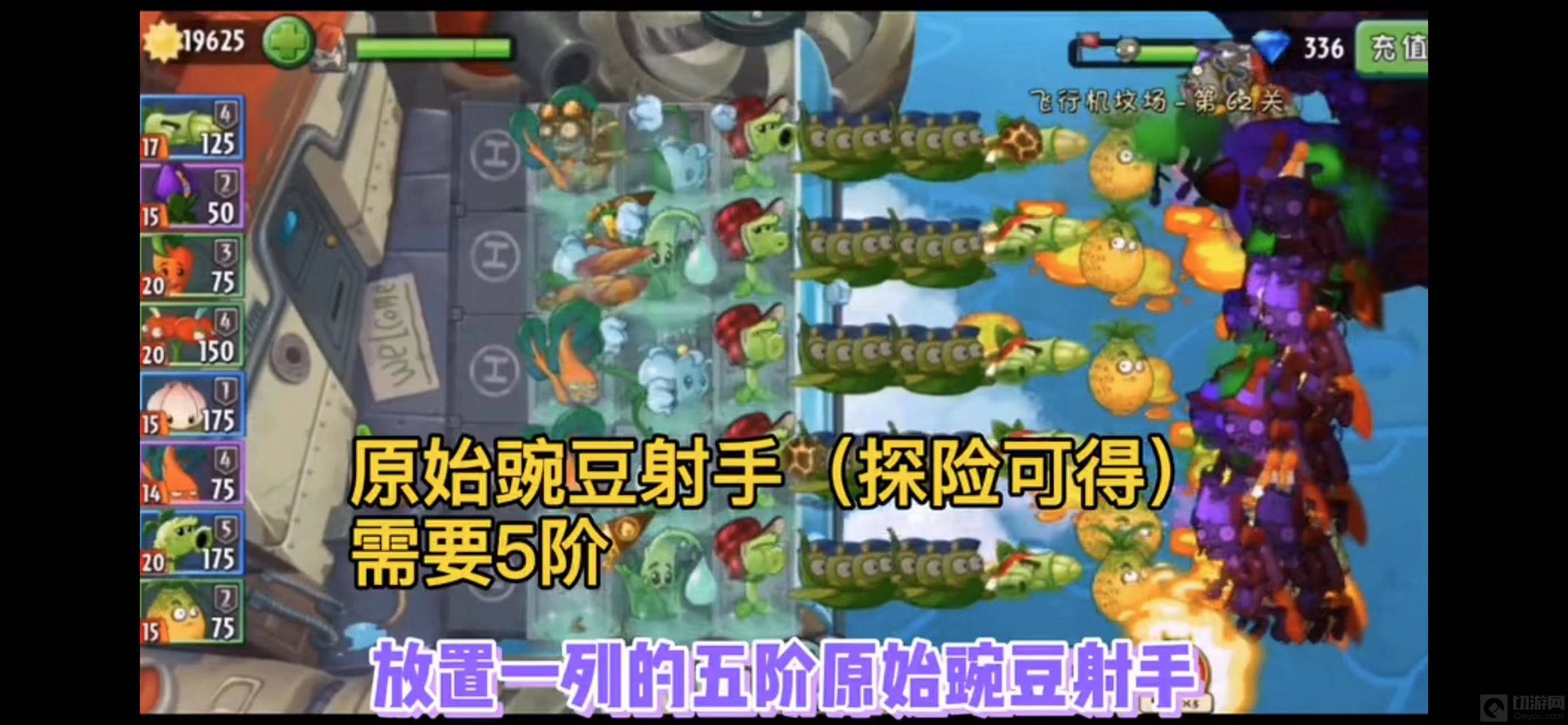 4、而在甲板上,因为格子非常的稀缺,建议大家在甲板上的右起第一列放置一列的五阶原始豌豆射手。