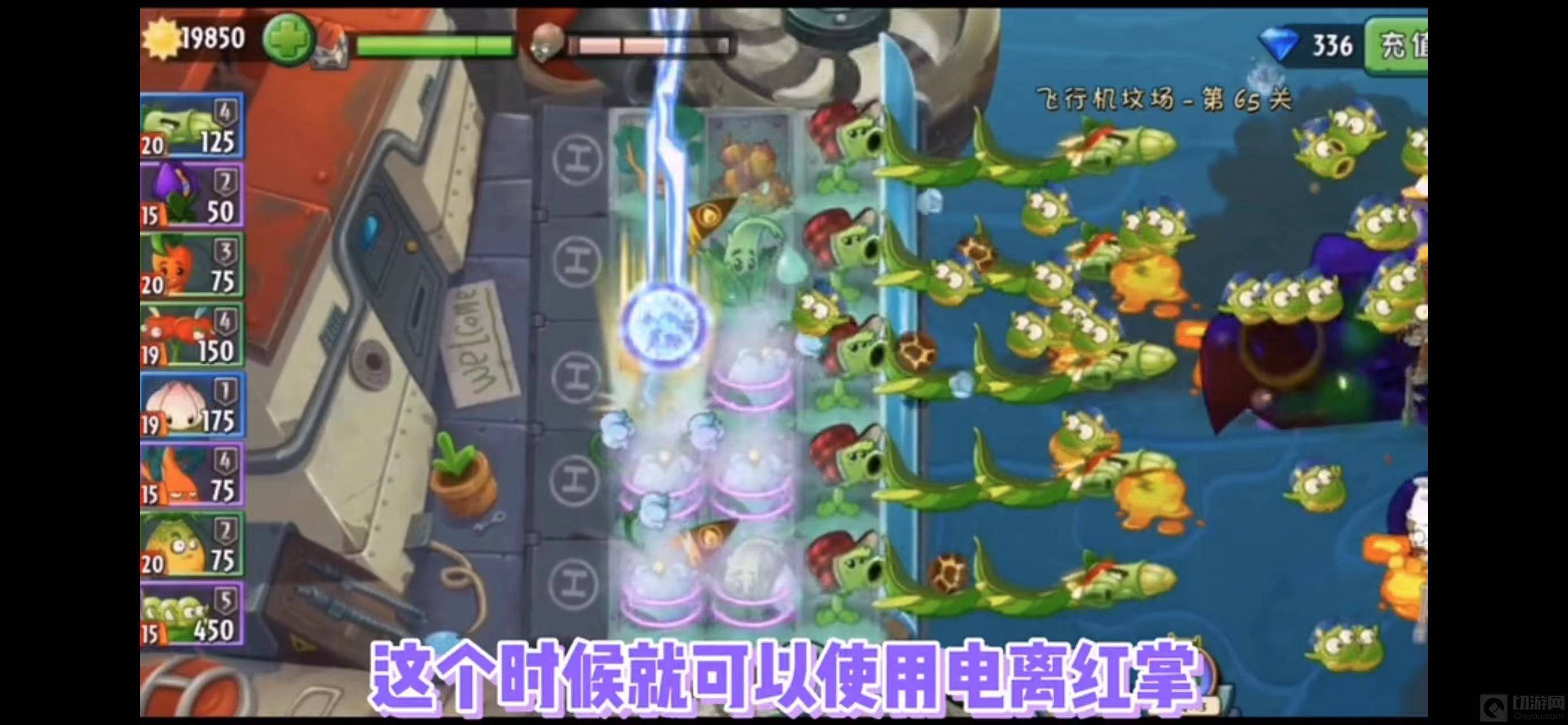 2、还有一种招式是他会对我们的植物进行雷电打击,给我们的植物附加一层正极,这个时候就可以使用电力红掌直接开大解掉这些植物的正负极。