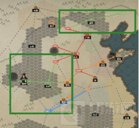 3、第三步绿线:此时已经较强了,可以等渔阳出兵伐空白(此时渔阳只有千余人,是否出兵很明显,会有小人在扎营)的时候出兵,白嫖一座城,集中进攻三川,快速入主咸阳,基本上吃了咸阳的经济就随便玩了。