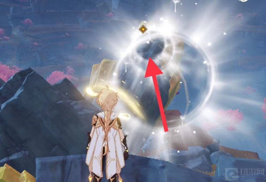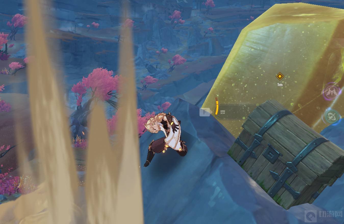 6、飞到巨石处后角色使用下落攻击或者岩元素战技对巨石进行击打。