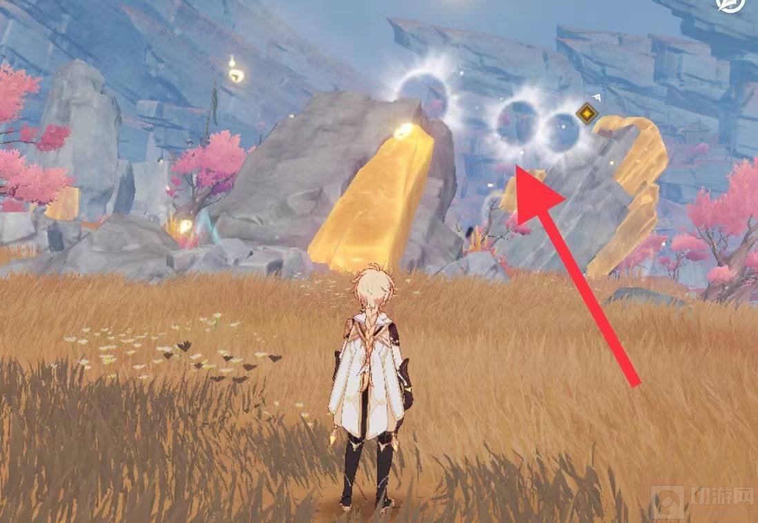 5、沿着巨石攀爬,来到加速光圈的位置,对着前面有金色光芒环绕的巨石飞去。