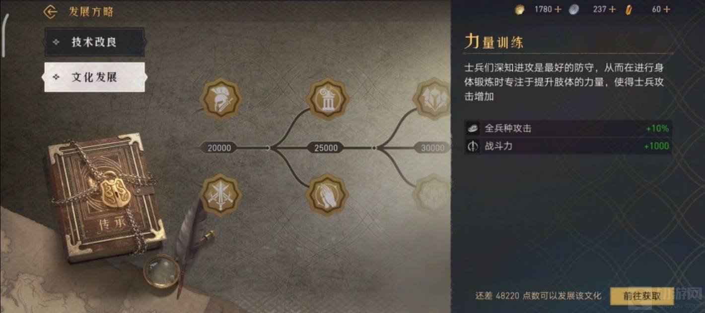 1、选择上面的“力量训练”。提升兵种攻击,战胜敌人的可能性更大了。