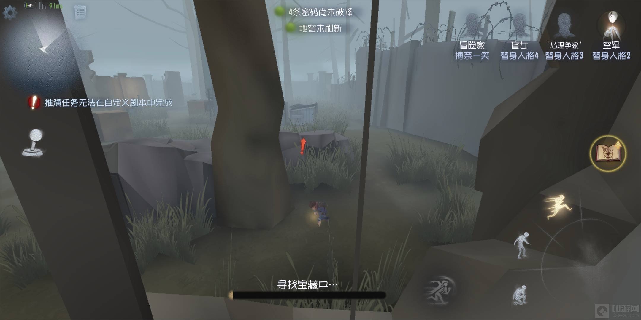 二、然后点击右侧的冒险书,可以缩小,缩小之后,会有提示,黄色的是宝藏距离提示,红色的是监管者距离提示。