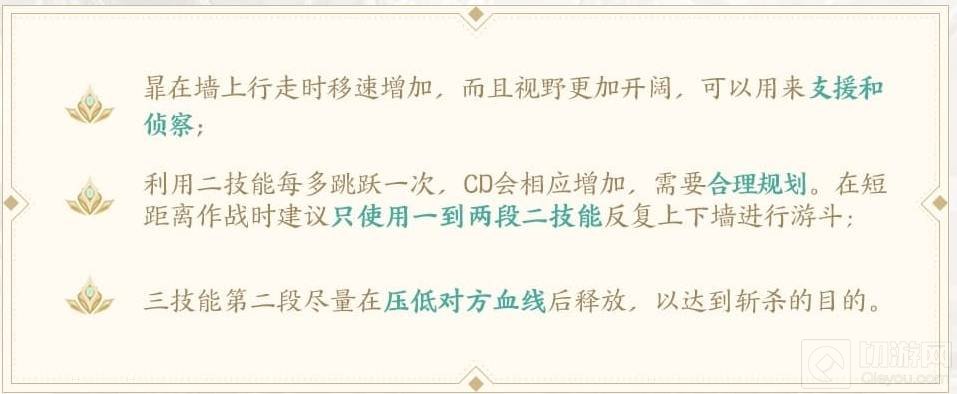 暃的机动性很强,可以快速进行支援,但要把握切入的时机,尽量寻找落单和残血击杀,尽量靠近墙体(敌方不容易打到),只要掌握好节奏就能获得胜利。