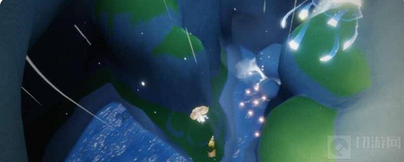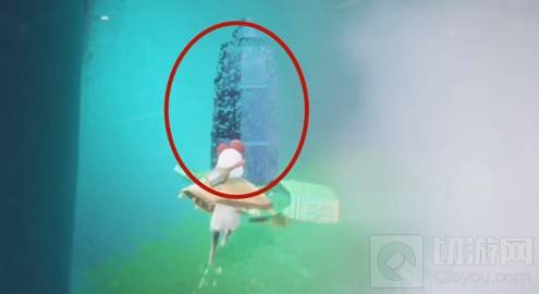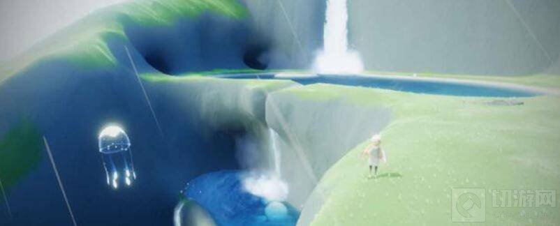 2、往瀑布的下游走,会看到漂浮的发光水母,跳入洞内,就会看到一个小瀑布和瀑布旁的钟。