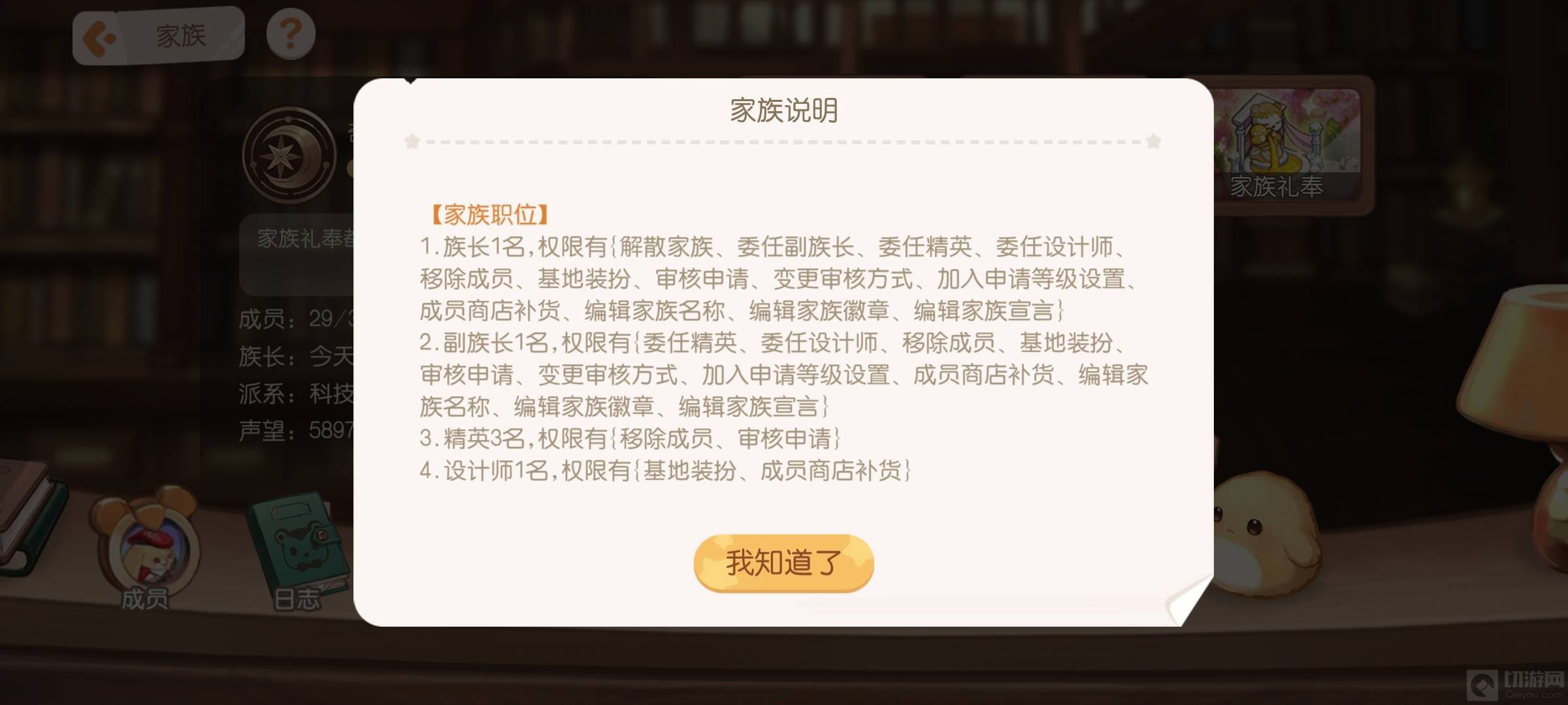 1、从家族说明可以知道,家族的构成是有族长、副族长、精英、设计师构成的。